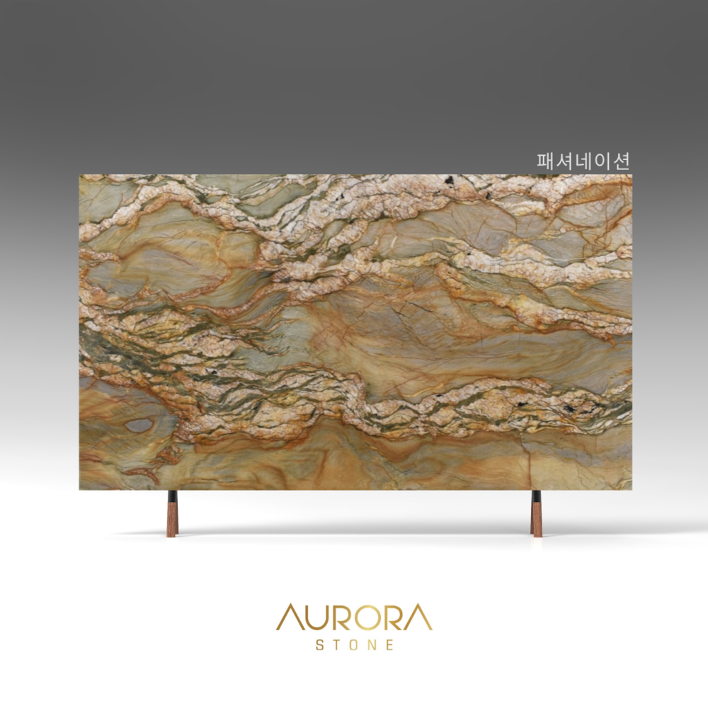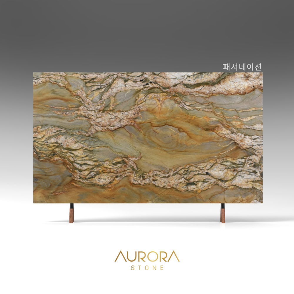 회색, 오렌지, 흰색, 검정 컬러가 조화롭게 섞여 있어 어느 공간에 배치하더라도 인테리어 요소로서 충분한 존재감을 발휘합니다. 자연에서 온 무늬를 그대로 살려 천연석 본연의 느낌을 극대화한 패셔네이션은 독특한 아름다움과 뛰어난 실용성을 동시에 갖춘 고급 석재입니다.