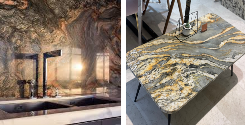황금빛 노란색과 짙은 갈색, 파란색, 검정색의 물결무늬가 어우러진 이국적인 천연석입니다. 이러한 색감과 패턴의 조화는 공간에 따뜻함과 생동감을 더하는 동시에 깊이감과 세련된 분위기를 연출합니다. 주방, 욕실, 벽면, 바닥 등 다양한 인테리어와 잘 어우러지는 실용적인 소재로, 단단한 강도를 자랑하며 오염과 마모에도 강한 내구성을 지니고 있습니다.