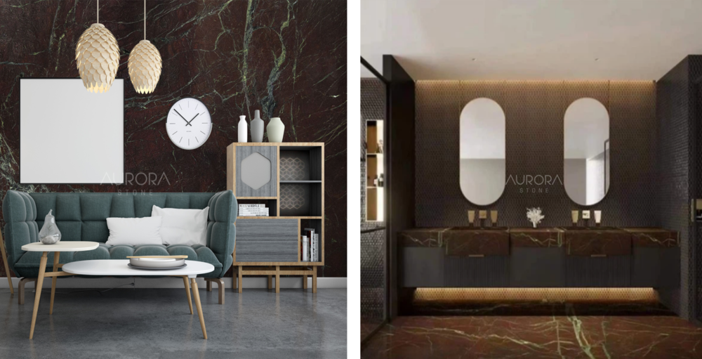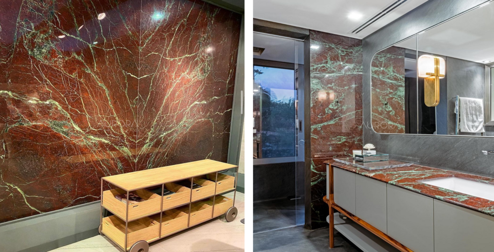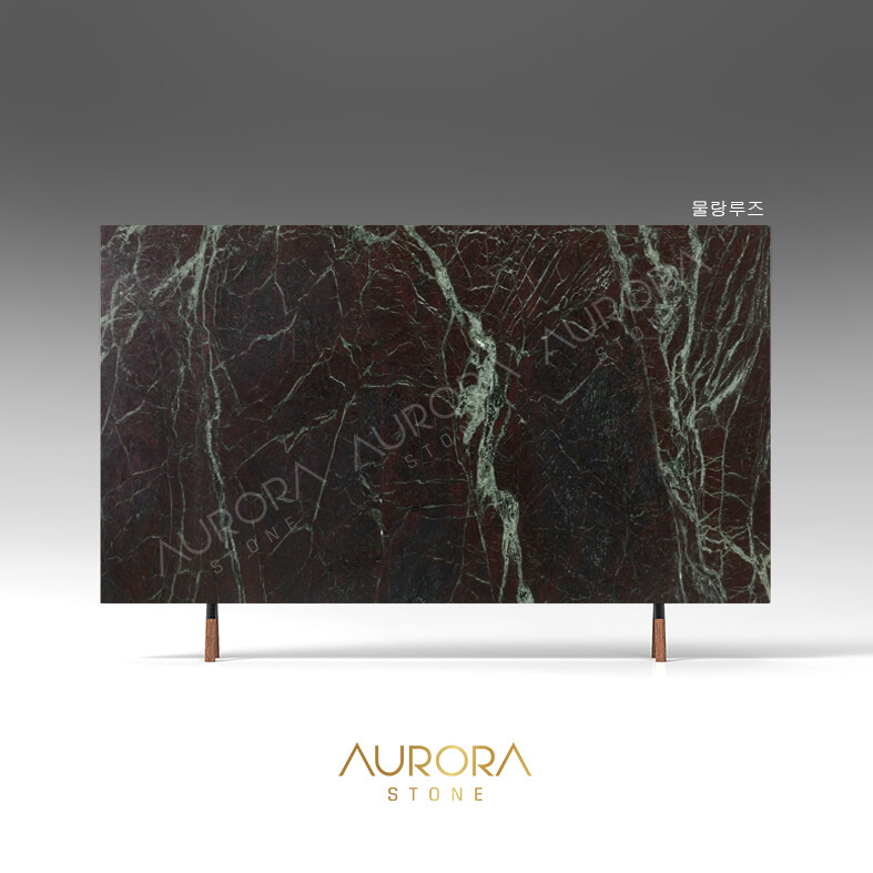 Moulin Rouge Quartzite는 브라질에서 채석된 매혹적이고 이국적인 천연석으로, 짙은 붉은색에서 버건디 색상까지의 배경과 옥색의 녹색 베인이 돋보이는 것으로 유명합니다. 이러한 독특한 색상과 패턴의 조합은 극적이고 럭셔리한 외관을 만들어내어 다양한 인테리어 연출을 가능하게 합니다.