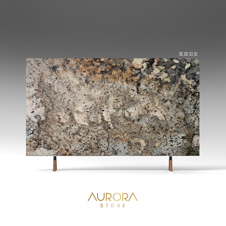 퀄츠 베이스 강도 7의 매우 단단한 고급 석재로, 일반 대리석과는 비교할 수 없는 뛰어난 경도와 내구성을 자랑합니다. 슬랩 전체가 토파지오 색의 석영과 크리스탈로 이루어져 있어 오닉스 계열의 고급스러움과 독창적인 매력을 지니며, 보석을 담은 듯한 빛나는 광택으로 공간을 한층 더 우아하게 연출합니다. 특히 토파지오 보석을 닮은 하이앤드 석종으로, 세련된 인테리어를 구현하기에 최적의 자재입니다.