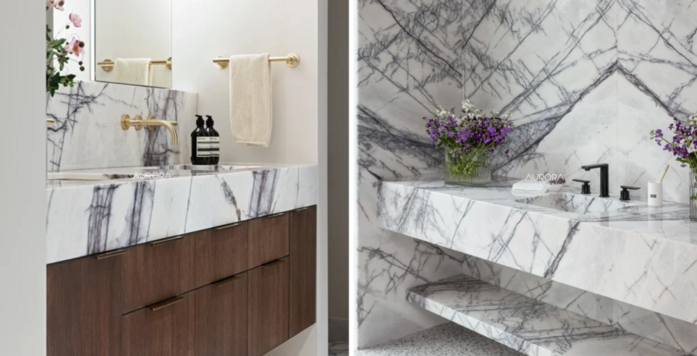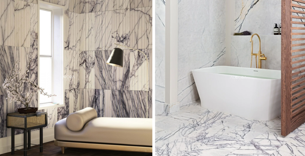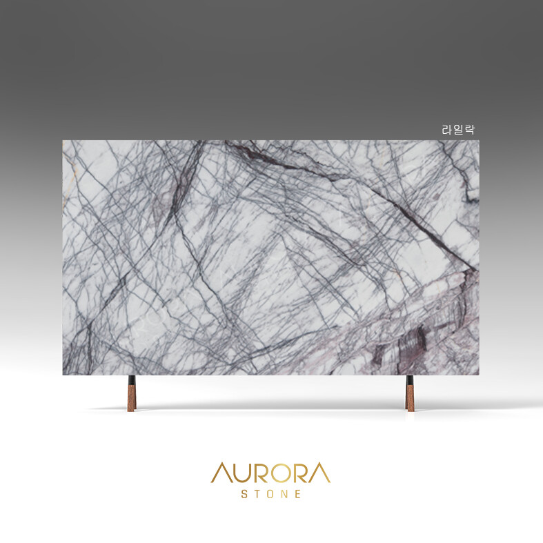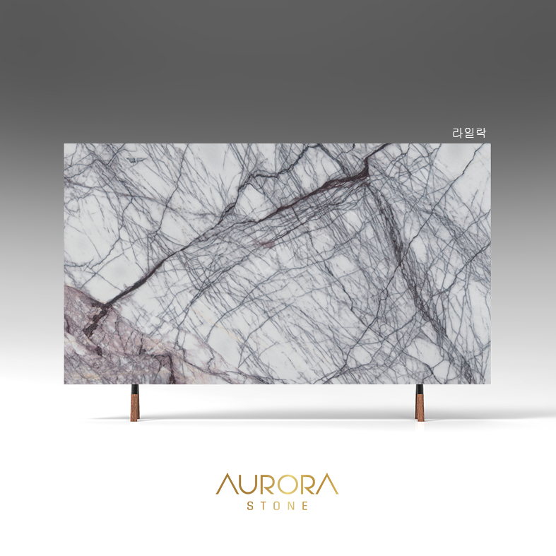 라일락(Lilac)은 화이트 베이스 위에 강렬한 보라·와인 컬러의 베인이 흐르는 독특한 석재입니다.