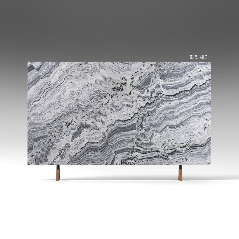 강도 4의 단단한 고급 석재인 피라세마 오리지널은 브라질산 천연 화강석으로, 아름다움과 실용성을 모두 갖춘 프리미엄 자재입니다. 깨끗한 화이트 배경 위에 블랙, 그레이, 브라운이 어우러진 물결 형태의 베인(Vein)이 특징으로, 자연이 그려낸 듯한 유려한 패턴이 시선을 사로잡습니다.
