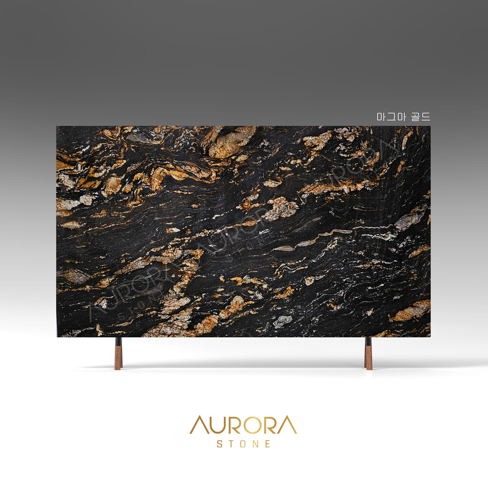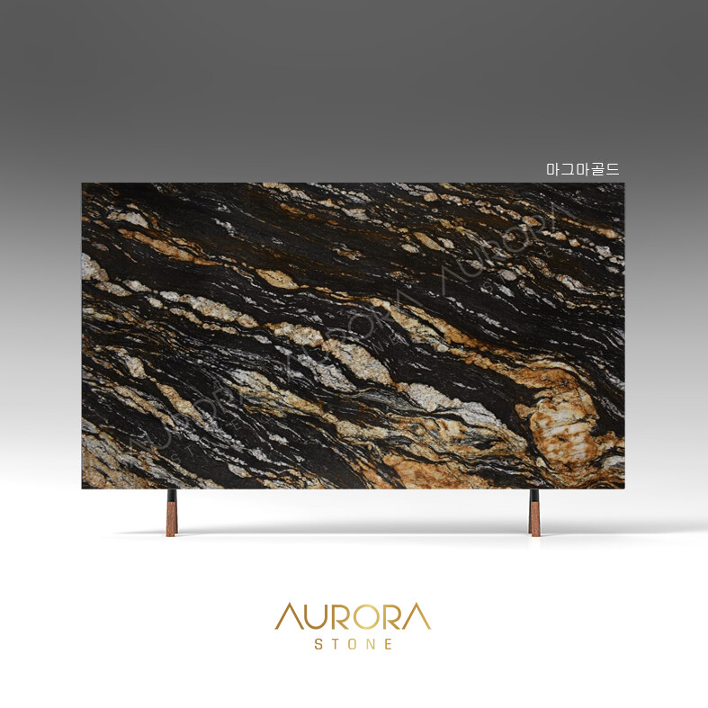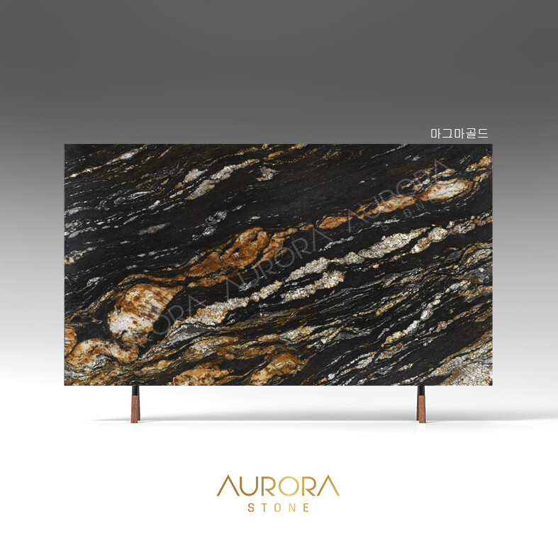 황금색과 검은색이 조화롭게 어우러진 특이한 무늬를 가지고 있는 마그마골드는 돌의 표면을 아름답게 장식하며,