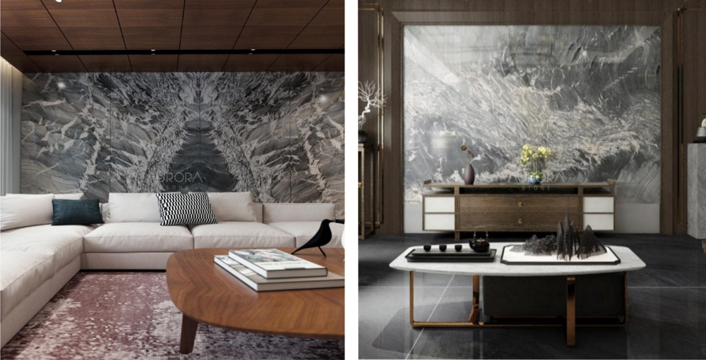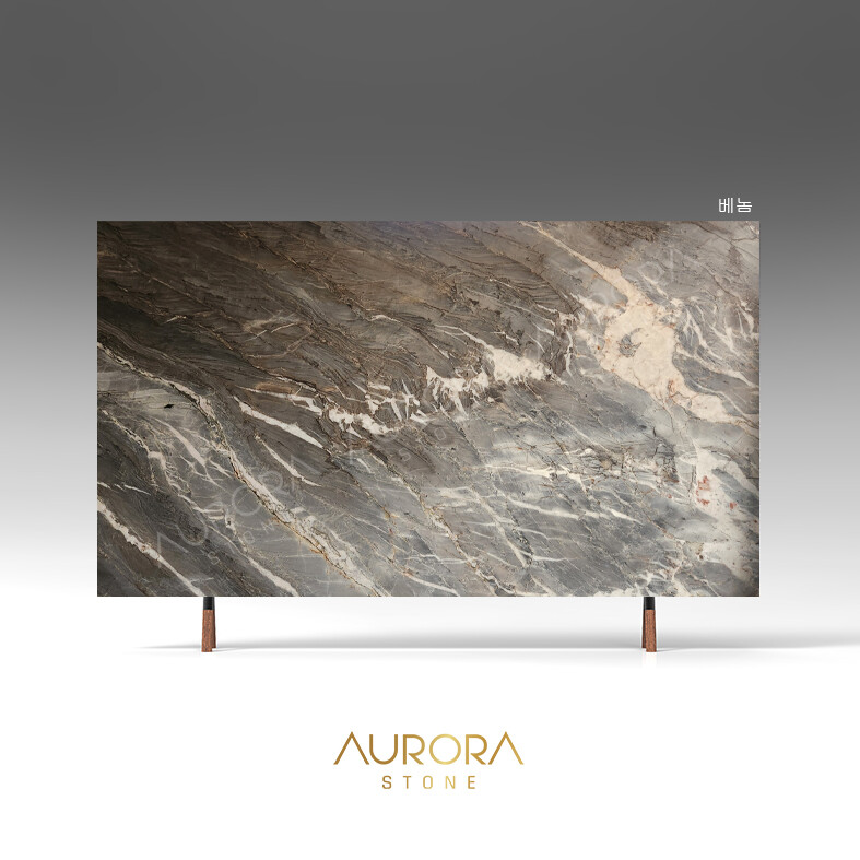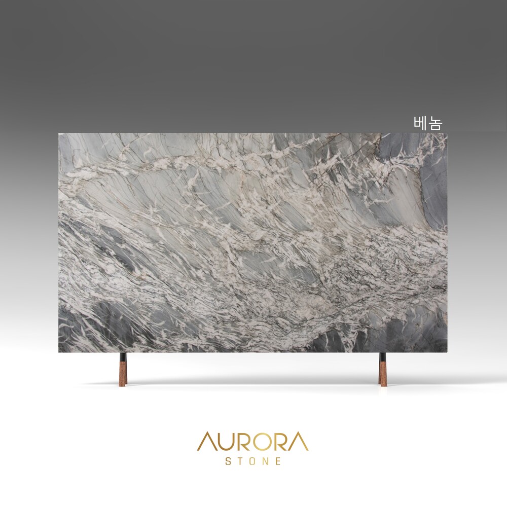 베놈 대리석은 그레이와 다크 브라운을 바탕으로 강렬한 화이트 베인이 흐르며 독특한 존재감을 보여주는 고급 석재입니다. 마치 자연이 그려낸 회화 작품처럼 유려한 무늬가 살아 있으며, 부분적으로 은은한 골드와 베이지 톤이 더해져 단조롭지 않은 깊이감을 자아냅니다. 특히 대각선으로 뻗은 패턴과 중앙의 굵직한 화이트 라인은 번개가 스치는 듯한 역동적인 분위기를 연출해 공간에 강렬한 인상을 남깁니다.