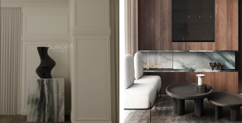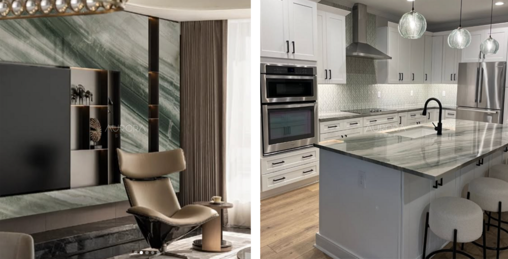 폴라리스는 아이보리색 바탕에 강렬한 에메랄드 그린과 그레이 베인이 어우러진 고급 천연석으로, 곳곳에 흩어진